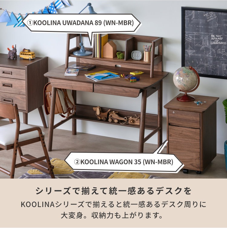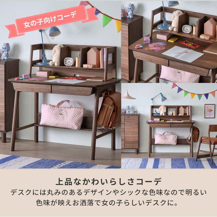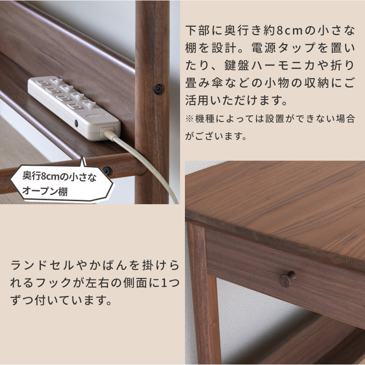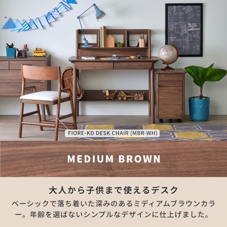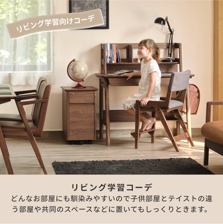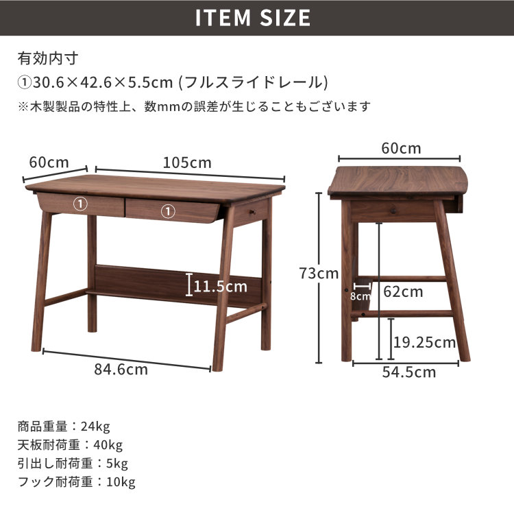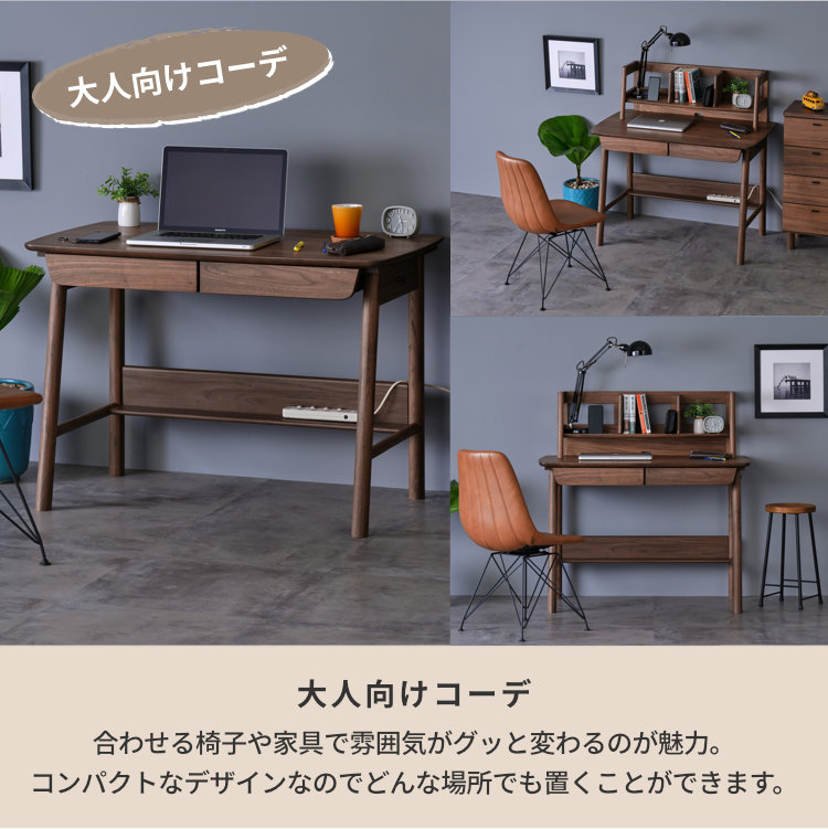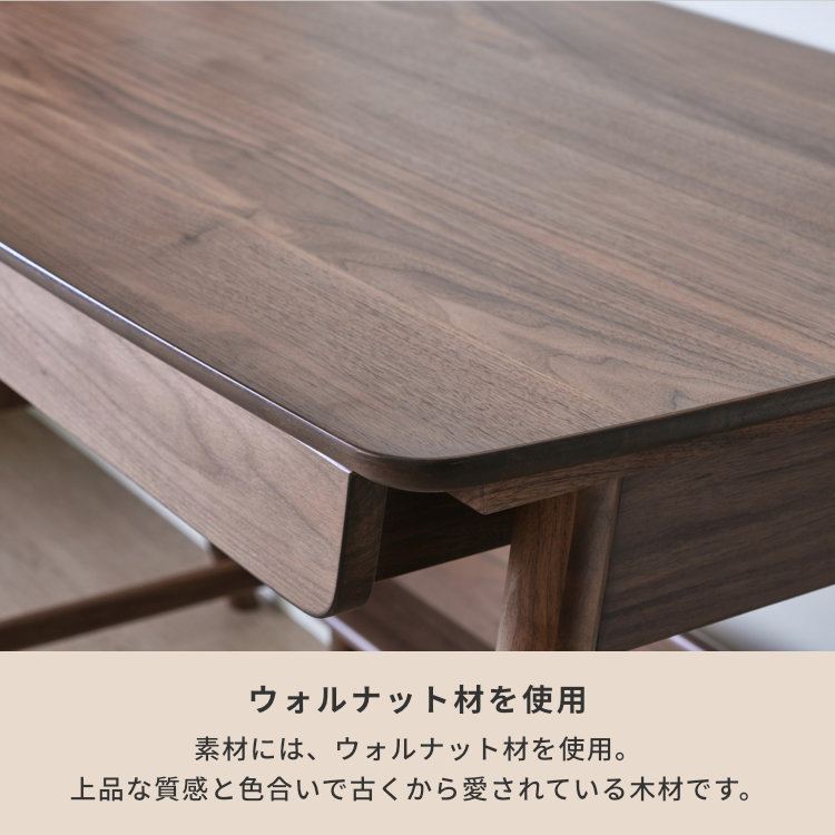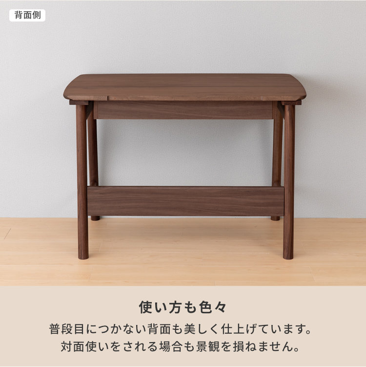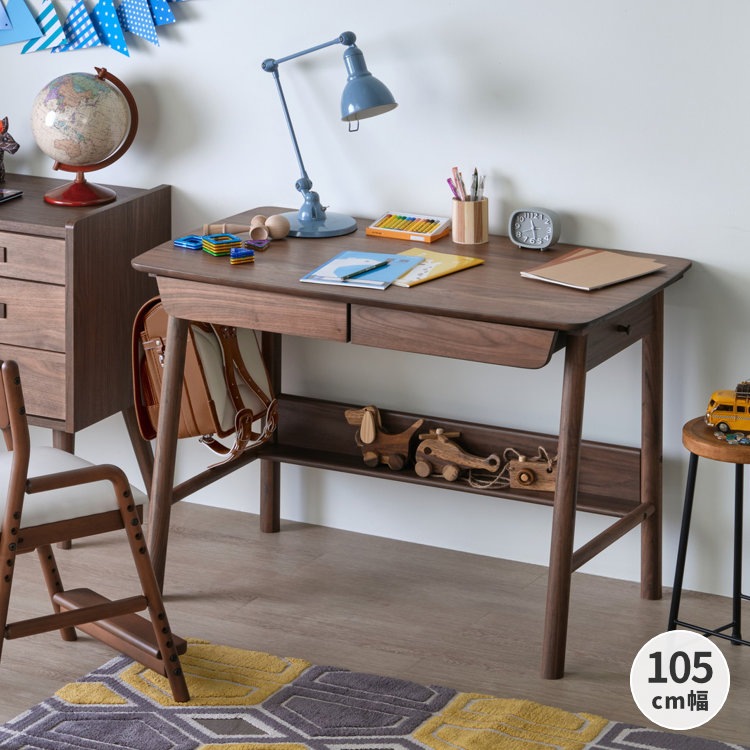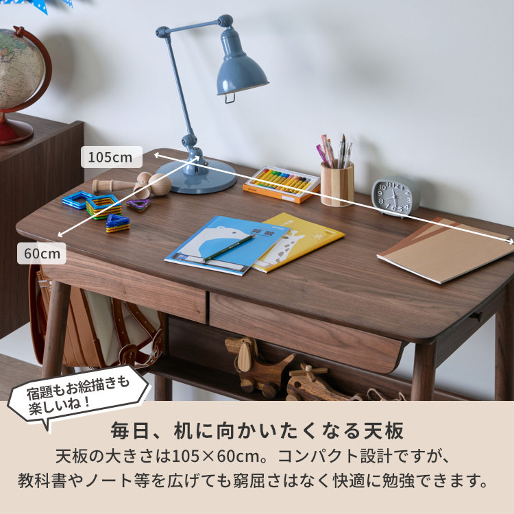 深みのある美しいブラウンが高級感を生み出す、ウォールナット材を贅沢に使用した幅105cmの学習デスクです。シンプルなフォルムと飽きの来ないデザイン。落ち着いた印象なので、お子様が大人になっても永く使用できます。勉強机としてはもちろん、パソコンデスクや書斎机にも使用しやすい、年齢問わずにお使いいただけるデスクです。奥行60cmと広さに余裕ある天板で、PCモニターを置いても書類やノートを広げられます。